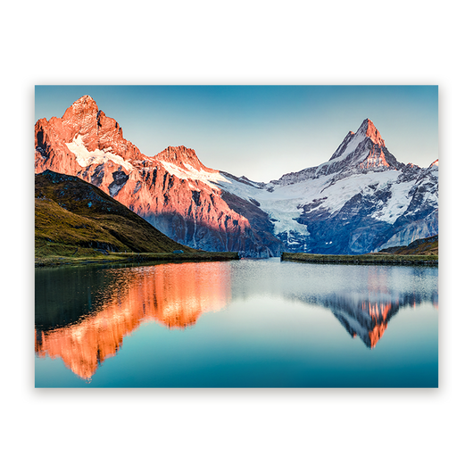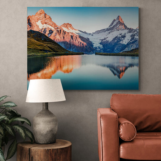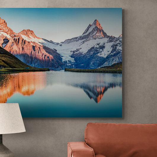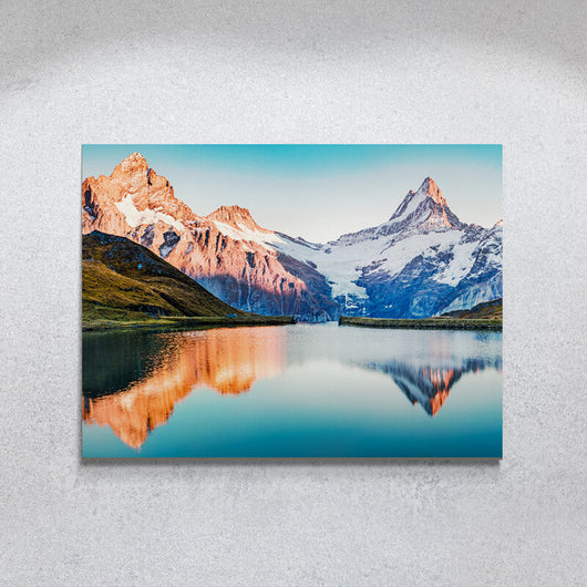 Laat het schilderij Zwitserse Avonddroom uw interieur transformeren met de vredige uitstraling van de Zwitserse avondhemel. De reflectie van de ondergaande zon op het Bachalp-meer is schitterend gevangen, waardoor het meer dan een beeld is - het is een beleving.